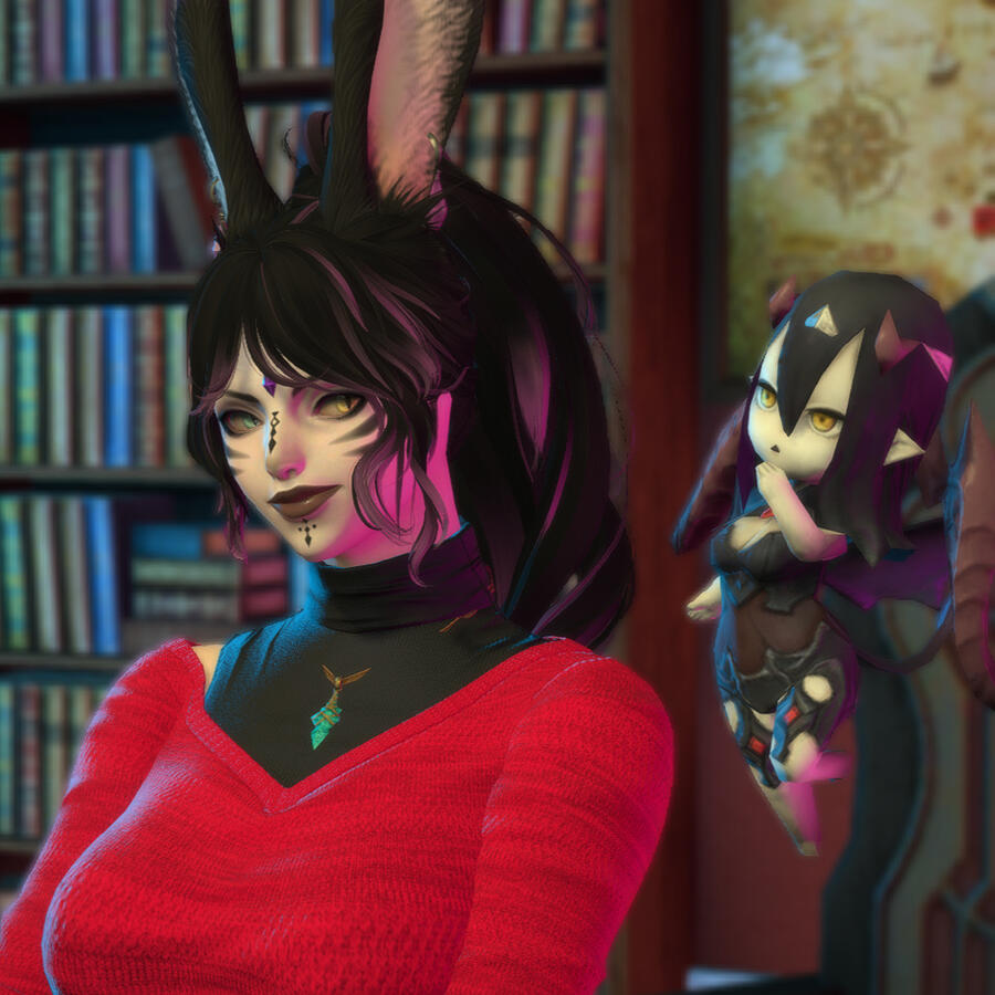 Chomi emigrated from Hingashi to Eorzea seeking a life of adventure, later befriending Mali along the way (whether he realized it or not). Chomi was never actually hired to the position of announcer, she just...Showed up one night and no one has stopped her yet.